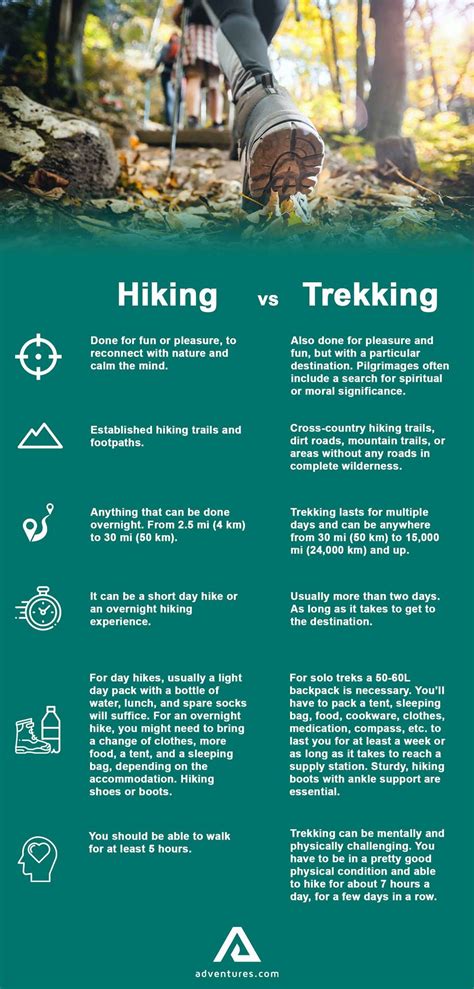 Trekking, on the other hand, is a more intense and challenging activity. It often involves multi-day journeys through remote and rugged areas. Unlike hiking, trekking requires carrying all of your gear with you, including camping equipment and food. Trekking trails are usually not as well-marked as hiking trails, and they may require navigation skills and outdoor experience. Trekking can be a great way to test your limits, explore off-the-beaten-path destinations, and immerse yourself in nature.